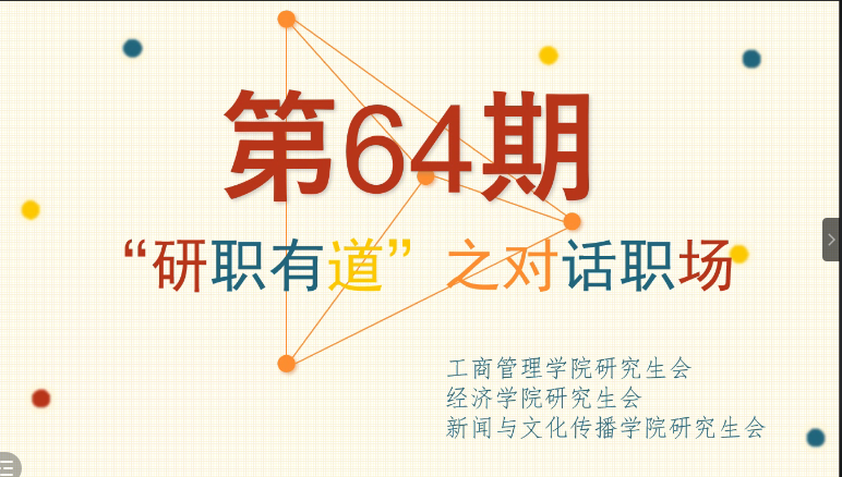 (通讯员:任一诺)2020年11月28日下午2点到4点,第64期“研职有道”—知己知彼,对话职场线上讲座通过腾讯会议成功举行。此次活动由中南财经政法大学研究生院、党委研究生工作部、中南财经政法大学研究生会主办,工商管理最快足球比分 研究生会、最快足球比分 研究生会和新闻与文化传播最快足球比分 研究生会共同承办。