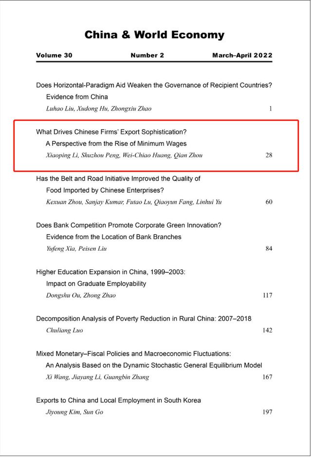 2022年3月,最快足球比分 教师李小平教授合作论文《What Drives Chinese Firms’ Export Sophistication? A Perspective from the Rise of Minimum Wages》在期刊《China & World Economy》上正式刊出。