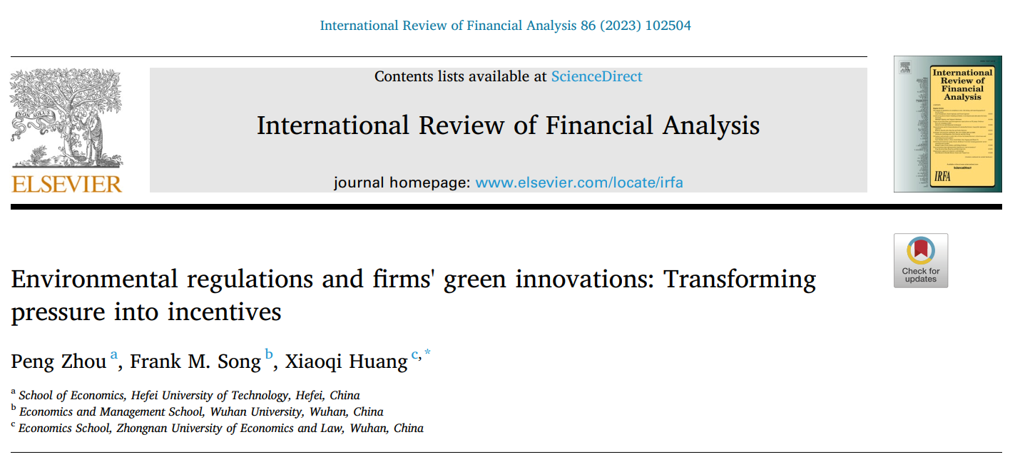2023年3月,最快足球比分 教师黄晓琪博士为通讯作者的合作论文《Environmental regulations and firms' green innovations: Transforming pressure into incentives》在期刊《International Review of Financial Analysis》第86卷正式刊出。