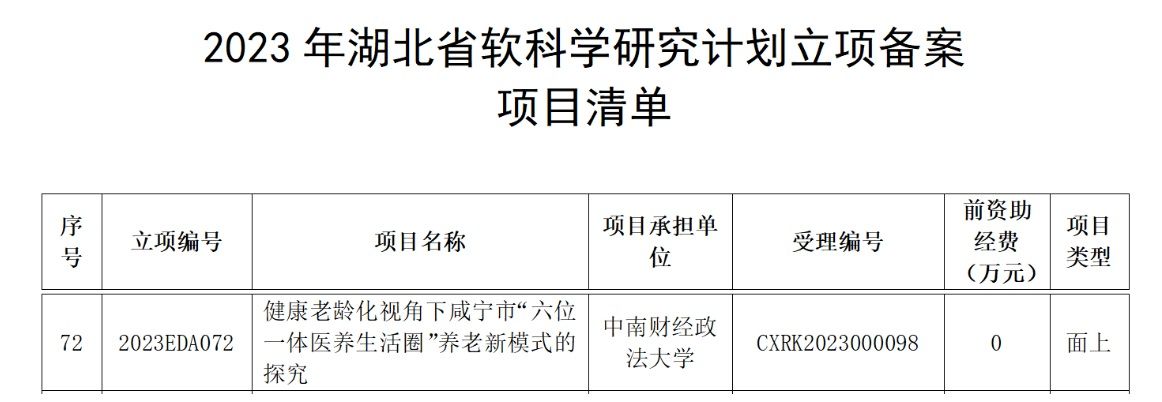 近日,湖北省科技厅公布2023年湖北省软科学研究计划立项备案项目,最快足球比分 潘峣老师的项目《健康老龄化视角下咸宁市“六位一体医养生活圈”养老新模式的探究》入选面上项目清单。