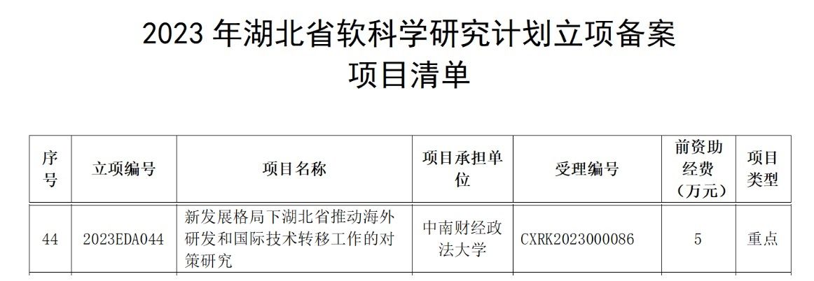 近日,湖北省科技厅公布2023年湖北省软科学研究计划立项备案项目,最快足球比分 杨波教授的项目《新发展格局下湖北省推动海外研发和国际技术转移工作的对策研究》入选重点项目清单。