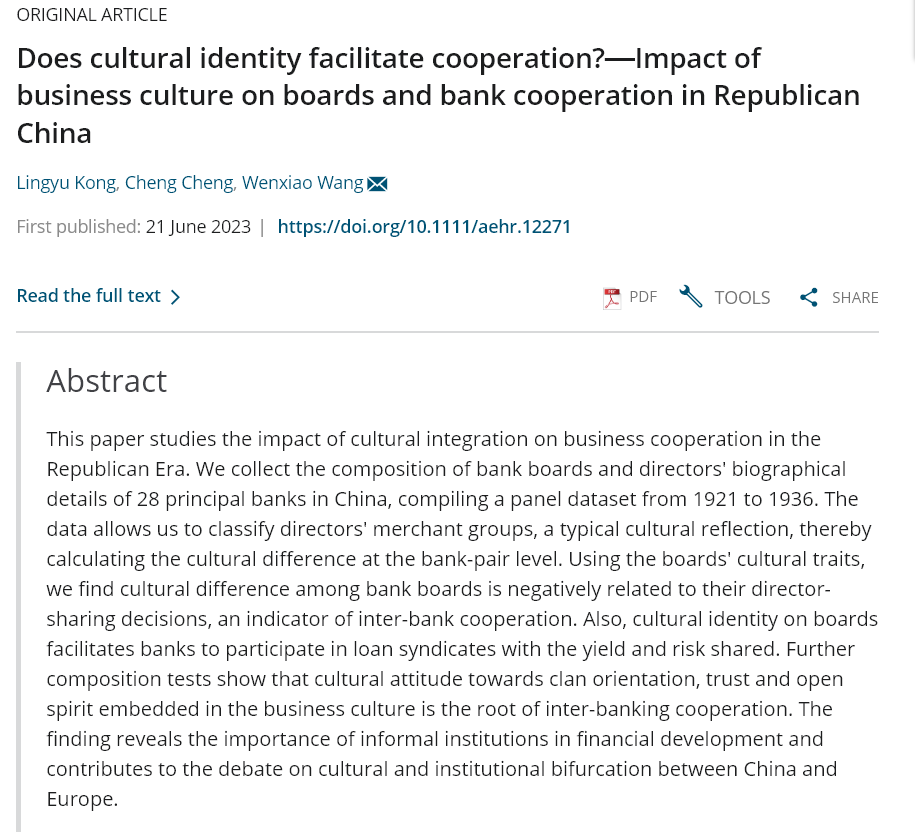 2023年6月,最快足球比分 孔令宇副教授为第一作者的论文“Does cultural identity facilitate cooperation?—Impact of business culture on boards and bank cooperation in Republican China”,在SSCI刊物《Asia-Pacific Economic History Review》上发表。
