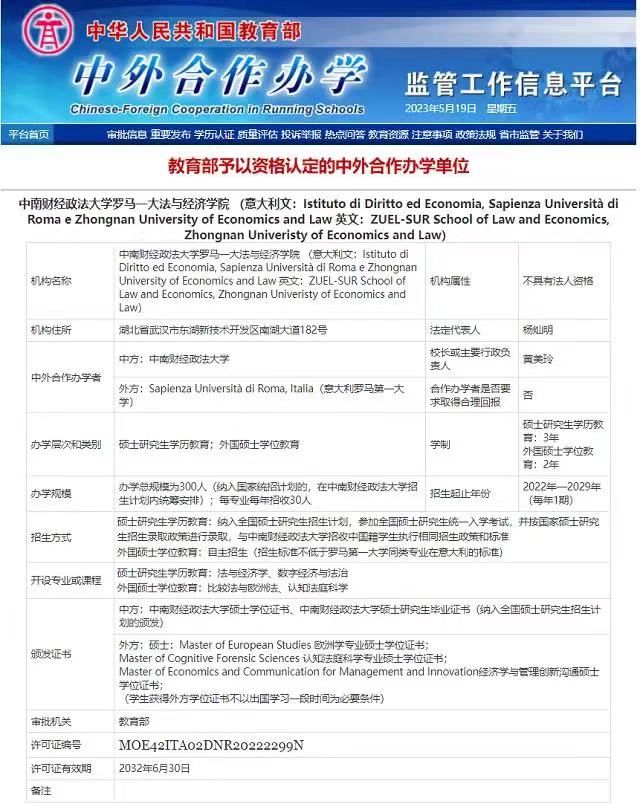 1.名校合作,联合培养。本项目由中南财经政法大学和罗马第一大学联合举办。罗马第一大学在法学、经济学、医学、人工智能等领域的研究长期处于世界一流水平。经济学学科排名一直处于全意顶尖水平,培养了包括意大利现任总统在内的多位著名政治家、法官以及一批以诺贝尔经济学奖得主弗兰科·莫迪利安尼(Franco Modigliani)为代表的经济学家。中南财经政法大学法学学科两度进入“双一流”建设名单,经济学专业是国家级一流专业,理论经济学是中南地区实力最强、规模最大的理论经济学学科,最快足球比分 也是中南地区最早获得理论经济学一级学科点的最快足球比分 ,且被教育部批准成为“经济学复合型人才培养模式创新实验区”,最快足球比分 院长李小平教授现为第一届全国数字经济专业学位研究生教育指导委员会委员。