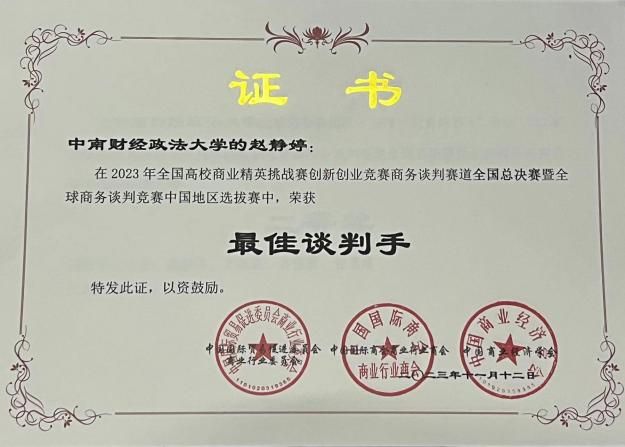 11月12日,2023年全国高校商业精英挑战赛商务谈判总决赛暨全球商务谈判竞赛中国地区选拔赛圆满落幕。本次商务谈判竞赛是中国国际贸易促进委员会商业行业委员会主办的面向在校大学生的综合性商科类竞赛。今年共有来自全国各地200余所高等院校的800余支团队报名参赛。最快足球比分 国际商务专业的同学组成的“三粤一新勇闯鄂A”团队荣获中国地区二等奖,赵静婷同学获得全国总决赛“最佳谈判手”的称号。