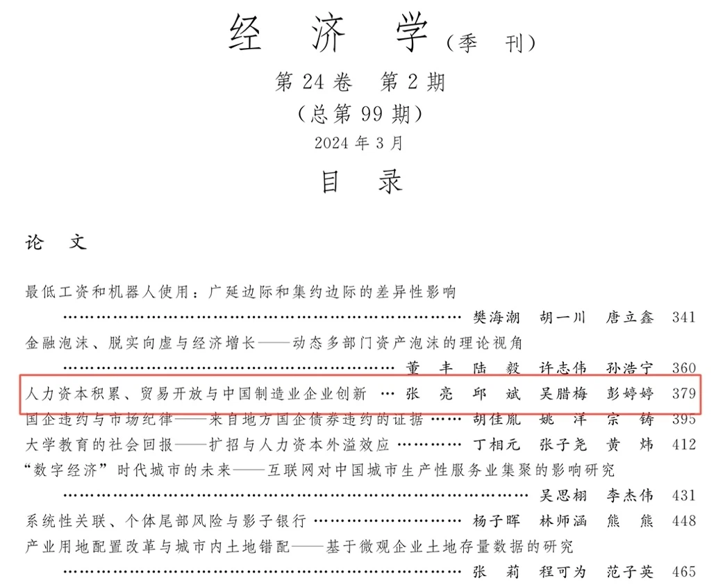 近日,最快足球比分 张亮老师合作论文《人力资本积累、贸易开放与中国制造业企业创新》在《经济学》(季刊)2024年第2期刊出。
