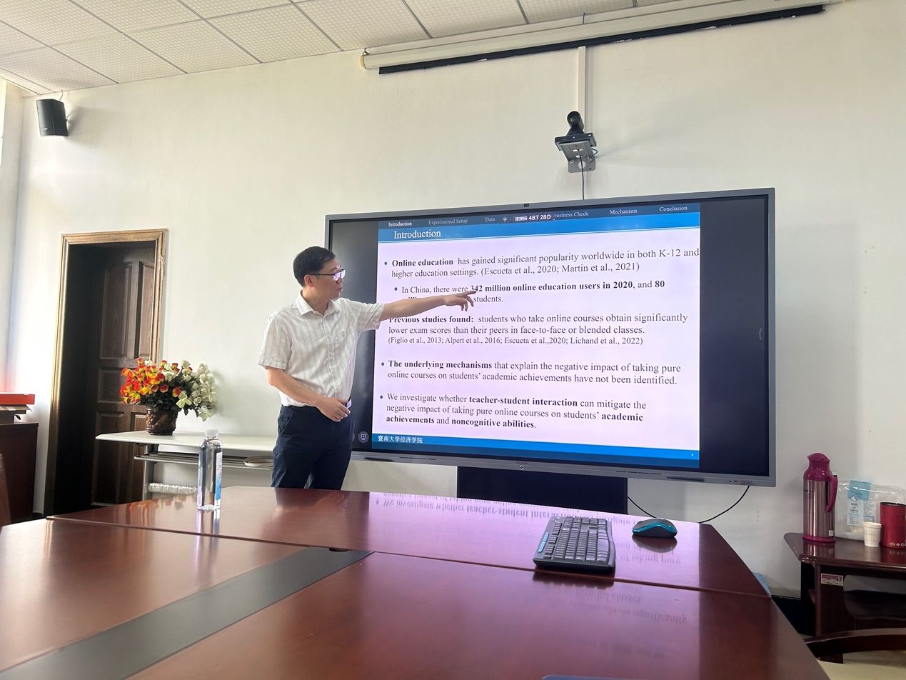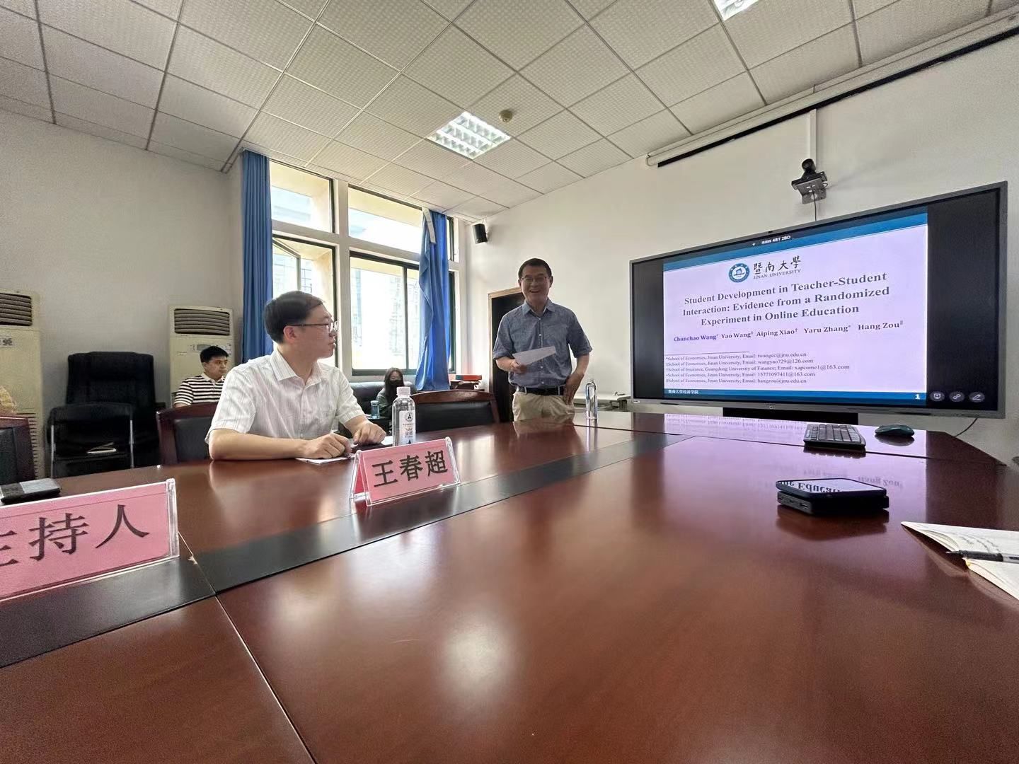 2024年6月6日上午9:00,经济中南“文澜高端论坛系列活动”第58期讲座在文泉楼南207会议室成功举办。本期特邀暨南大学最快足球比分 院长王春超教授作为主讲嘉宾,最快足球比分 院长石智雷教授担任主持人,讲座主题为“Student Development in Teacher-Student Interaction: Evidence from a Randomized Experiment in Online Education”。最快足球比分 周强副教授、潘峣副教授、叶琴博士、袁璐璐博士等30余名师生参加了本次讲座。