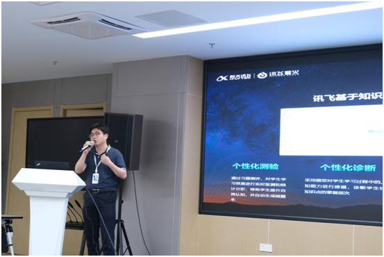我校师生一行首先参观了科大讯飞人工智能展厅,在讲解员的介绍下,了解了科大讯飞公司的发展历程,讲解员结合科大讯飞语音模拟识别、多语种实时翻译、机器人语音交互等产品邀请到场师生进行了互动体验,直观地展示了科技改变生活的魅力,人工智能成果化的体验与交流让在场学生感受颇深。现场参观结束后,师生一行来到四楼会议室进行深入交流。