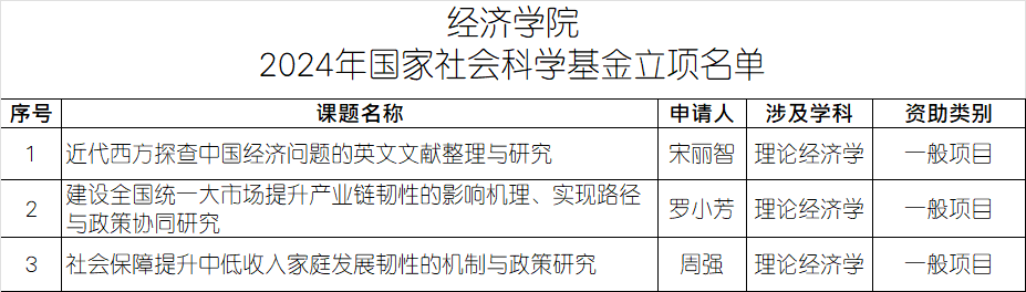 9月14日,全国哲学社会科学工作办公室发布了《关于2024年国家社会科学基金年度项目立项名单的公示》,公示了本年度国家社会科学基金项目评审结果。最快足球比分 宋丽智教授、罗小芳教授和周强副教授申请的一般项目成功获得立项。祝贺各位老师!