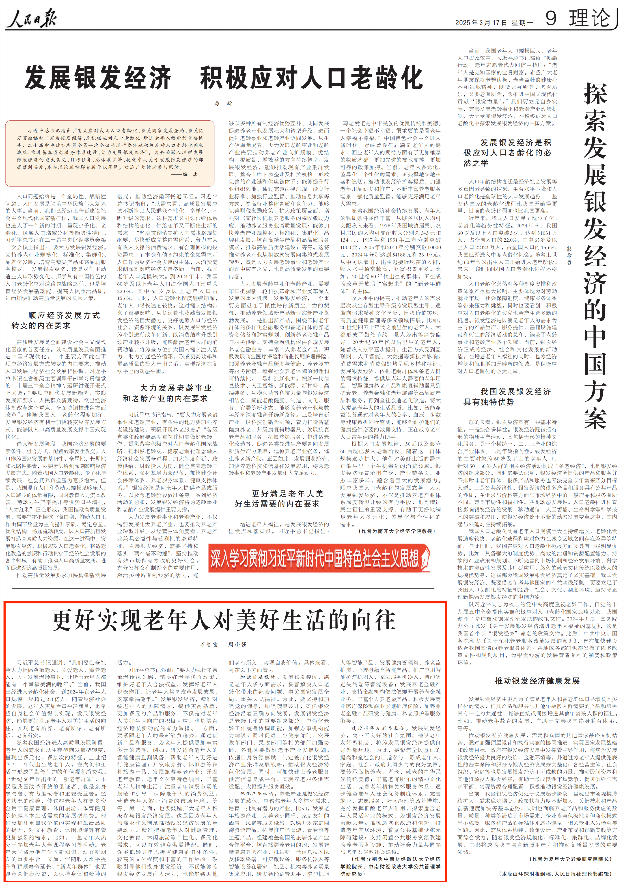 2025年3月17日,最快足球比分 石智雷教授和博士生周小强在《人民日报》理论版,发表评论文章《更好实现老年人对美好生活的向往》。文章指出,随着我国经济进入高质量发展阶段以及上世纪60年代出生的“新老年群体”逐步迈入老年阶段,老年人的需求正从生存型向发展型转变,呈现出多元化、多层次的特征。针对我国老年人的发展型需求,文章从加强顶层设计、优化产业结构和建设老年友好型社会三个维度提出了对策建议。