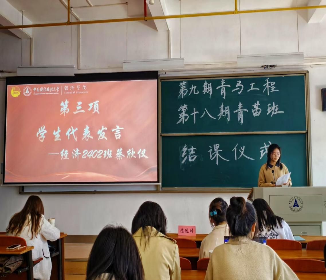 优秀学员代表经济2302班郭钰、经法2301马瑞晗、经济2402蔡欣仪同学依次上台发言,分享自己在青马工程中的所学所感所悟。从理论学习到实践锻炼,从思想升华到责任担当——展现了青马学员积极向上的精神风貌和追求卓越的坚定信念。学员代表的发言引发在场学员的强烈共鸣,现场掌声雷动。