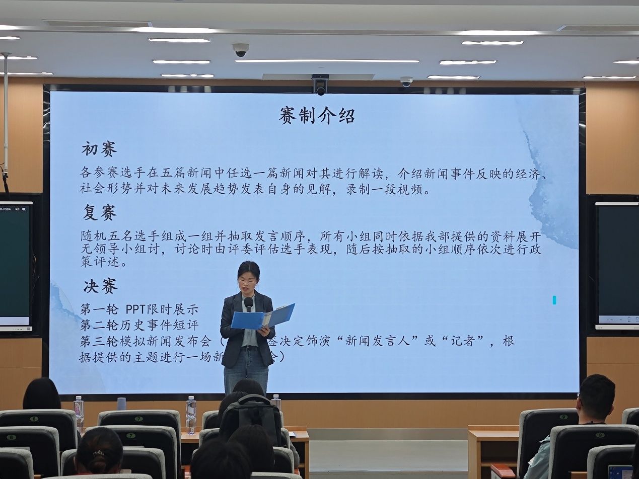 宣讲会伊始,张燕详细阐述了大赛的意义。她提到,大赛聚焦财经热点,旨在锤炼同学们专业素养与批判性思维,普及校园财经素养,营造浓厚学术氛围。接着她为大家介绍了大赛的流程。初赛采用线上形式,要求选手从5篇给定的新闻中挑选一篇进行评论并录制视频,旨在考察选手对财经新闻的分析解读以及表达能力,透过新闻现象挖掘深层次的经济社会发展状况。复赛为无领导小组讨论,以政策文件为讨论素材,着重考验选手的团队协作、沟通应变及逻辑思维能力。决赛则以即兴展示为主,包含PPT展示、历史事件短评和模拟新闻发布会等环节,全面检验选手的综合素养,从观点提炼、历史分析到现场应变,每一个环节都对选手提出了高要求。
