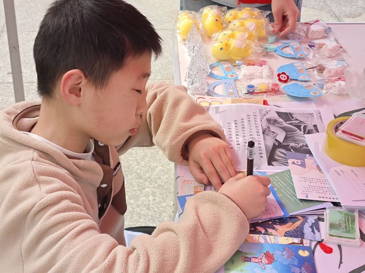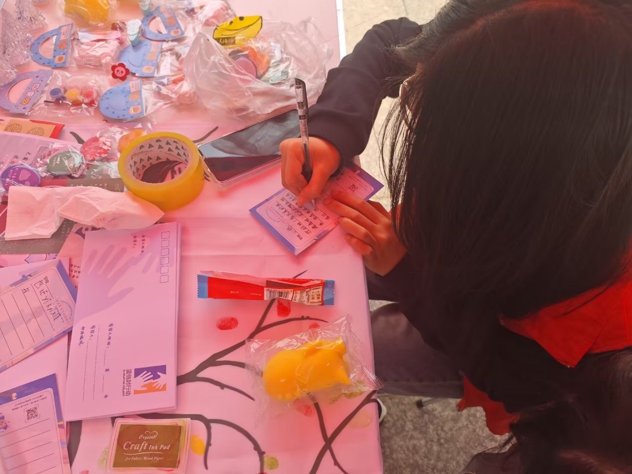 活动正式拉开帷幕,同学们被现场的氛围所吸引,纷纷驻足。他们认真地阅读着孩子们的烦恼卡片,脸上露出或同情或思考的神情。有的同学在卡纸上写下长长的回信,字里行间充满了鼓励与支持;有的同学则在指纹树上郑重地按下自己的指纹,用这种方式表达自己对孩子们的关心和对活动的支持;还有的同学在志愿者的邀请下,深入了解蓝信封通信大使的职责,当即表示愿意加入这个温暖的行列,为孩子们带去更多的关爱。