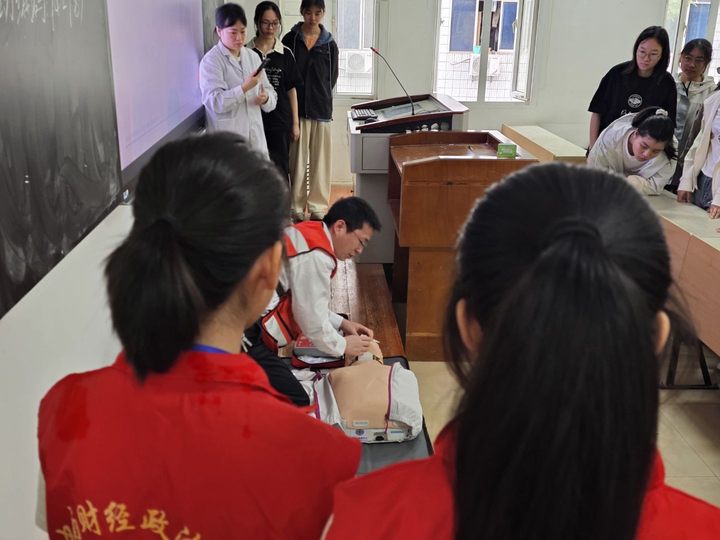 实操环节将活动氛围推向顶点,模拟假人整齐排列在讲台前,同学们开启这场“生命救援演练”。在操作演示中,医生亲自示范标准动作:双手交叠紧扣,腕、肘、肩三关节保持垂直,利用身体重心垂直下压,每一次按压都伴随着“01、02……”的清晰计数,动作刚劲有力却又精准有度。随后,同学们依次上前,在医生一对一的指导下,将理论知识转化为实际操作。有的同学起初略显紧张,按压节奏时快时慢;有的同学按压深度不足;有些同学找不准按压位置……种种问题都在医生的耐心指导下解决,参与实践的每个同学都成功完成了一次心肺复苏。通过这次实践,同学们不仅掌握了胸外按压、开放气道、人工呼吸的连贯操作,更重要的是克服了面对急救场景的恐惧心理,增强了在突发状况下沉着应对、科学施救的信心与能力。