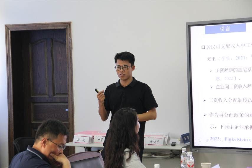 随后,武汉大学黄永颖副研究员以《在降费中走向公平:养老保险缴费差距与企业间收入不平等》为题作了报告,黄永颖副研究员利用全国税收调查数据,系统评估了降费率政策对企业间收入不平等的影响。研究发现,下调养老保险单位费率显著降低了企业间收入不平等,缴费差距缩小是重要的影响渠道。异质性检验发现,养老保险费率下调的收入分配效应在降费幅度大、逃避费严重和公众监督较弱的地区表现得更为明显。拓展性分析发现,降费率政策有助于进一步改善地区间的收入分配状况。黄永颖副研究员的研究,对于完善中国社会保险制度的再分配功能、扎实推进全社会共同富裕提供了丰富的政策启示。与会师生就养老保险缴费企业特征如国企与私企的异质性问题,养老保险基数调整对企业收入的影响以及全国税收调查数据的样本质量等问题展开了讨论。