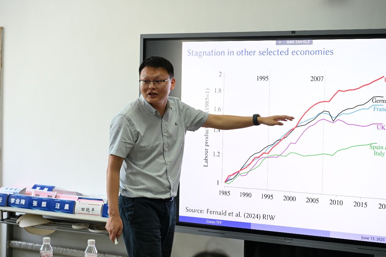 最后,中南财经政法大学戴胜副教授分享了题为《Can omitted carbon abatement explain productivity stagnation?》的报告。戴胜副教授重新构建了考虑碳减排成本的Fisher指数,并使用1990-201938OECD国家的投入与产出数据,对绿色全要素生产率进行再测算,并进行了稳健性检验。研究结果表明,在考虑碳减排成本后,绿色全要素生产率出现了显著增长,而传统的全要素生产则停滞不前,这意味着忽视碳减排成本将低估全要素生产率增速。最后,戴胜副教授指出,基于净零排放目标,未来十年需要进一步的投资和创新。在交流环节,与会师生针对修正后的绿色全要素生产率指数的经济含义、碳减排成本的测度及模型处理、两类全要素生产率指数的变化趋势等问题展开了热烈讨论。