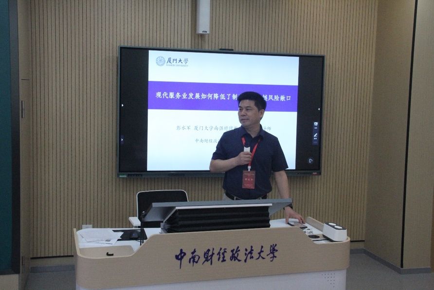 随后,厦门大学彭水军教授以《现代服务业发展如何降低了制造业价值链风险敞口》为题作了学术报告。彭教授首先指出,从理论及已有研究来看,服务业发展对制造业的影响并不明确,而在当前单边主义、保护主义加剧的背景下,中国制造业面临供给与需求的双重挤压,并提出以金融、商业服务业为代表的现代服务业发展如何影响一国制造业价值链风险敞口这一关键问题。接着,彭教授具体介绍了研究设计和指标构建,发现金融服务业发展能够缓解发达经济体制造业的融资约束,通过资本技能互补机制,引致高技能劳动和智力资本更多流入制造业部门,增强了制造业协调整合复杂供应网络、多元化进口中间品的能力,从而降低了进口中间品来源国的集中度,促使制造业生产风险的下降。在交流环节,与会师生对中美服务业差异、工具变量的构建、机制检验等问题展开了热烈的讨论。