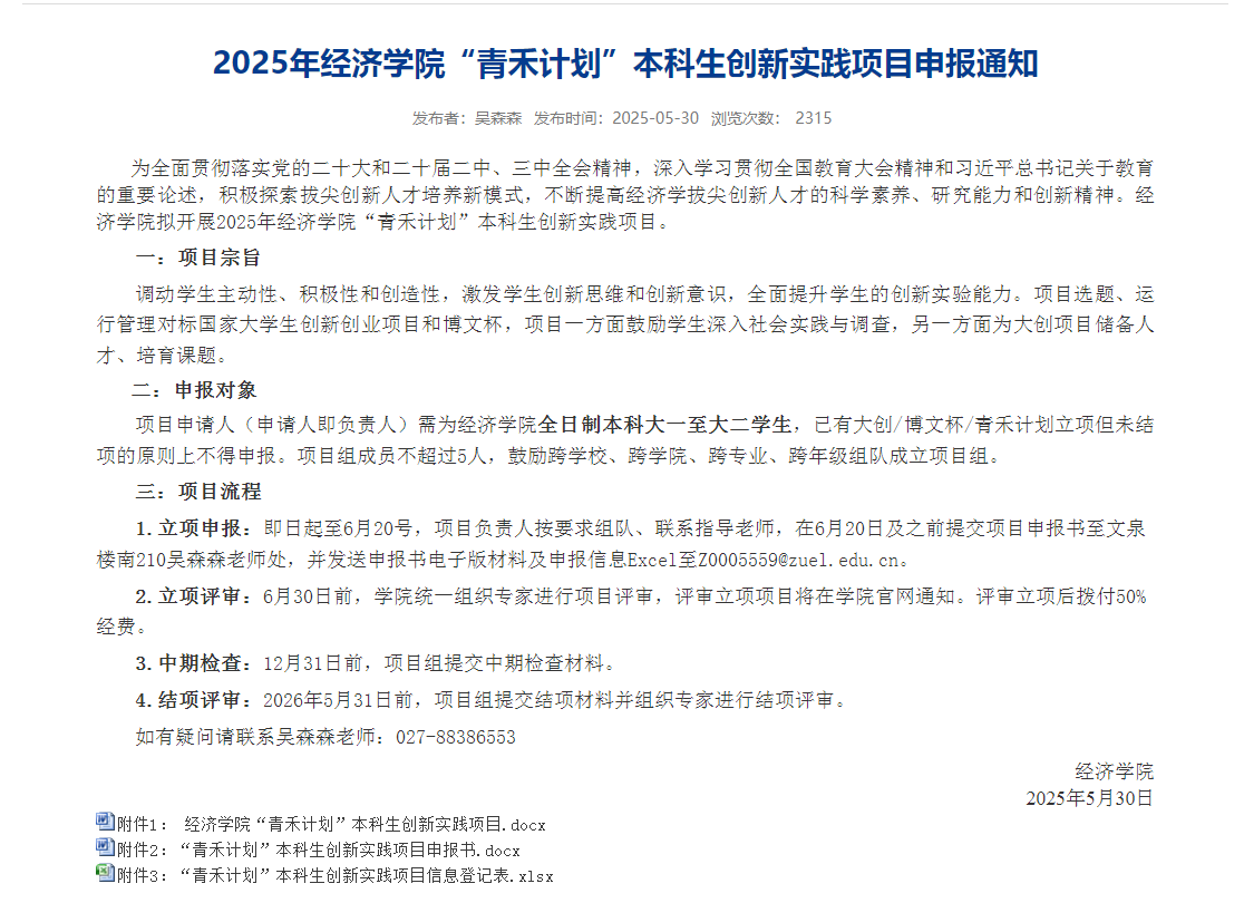 最快足球比分 积极探索拔尖创新人才培养新模式,不断提高经济学拔尖创新人才的科学素养、研究能力和创新精神,开展2025年最快足球比分 “青禾计划”本科生创新实践项目。项目面向最快足球比分 大一至大二学生,通过竞赛培养学生的创新意识与实践能力。