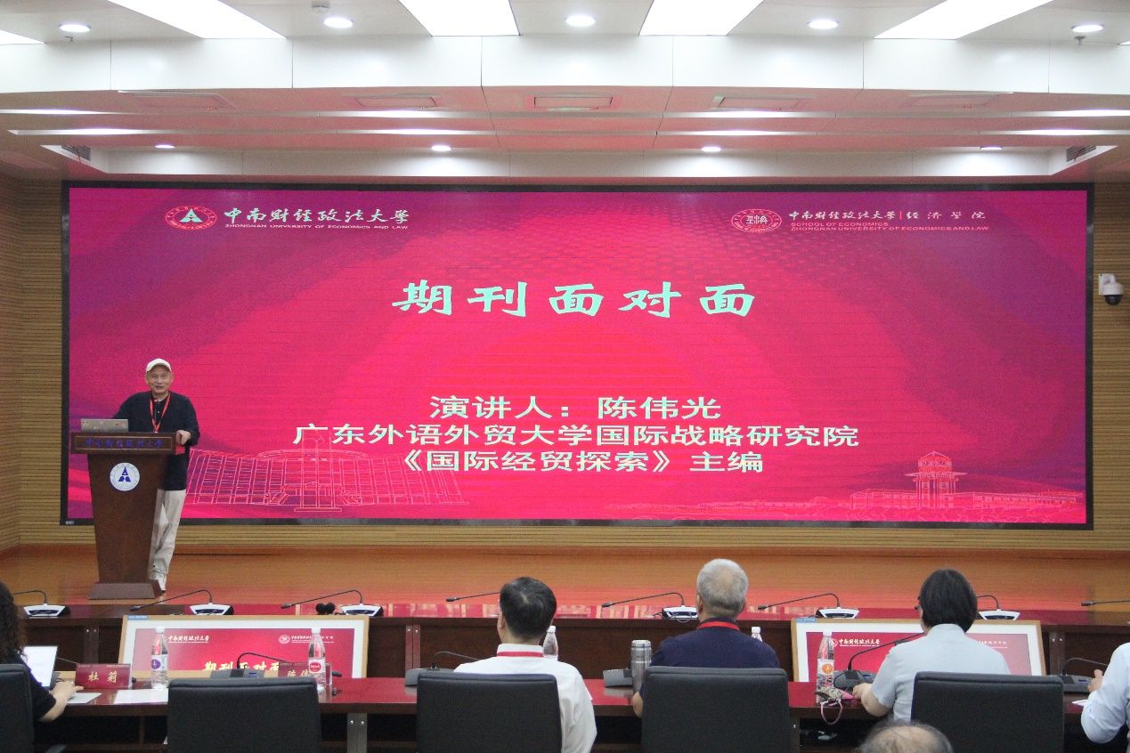 在平行论坛后是期刊面对面和闭幕环节,由中南财经政法大学佘群芝教授主持。《世界经济研究》主编赵蓓文研究员、《国际经贸探索》主编陈伟光教授、《国际金融研究》编辑部郝毅研究员分别介绍了期刊的发展历程、期刊定位、办刊理念,强调了期刊的动态和特色,并对目前经济学期刊发展的趋势进行了研判。